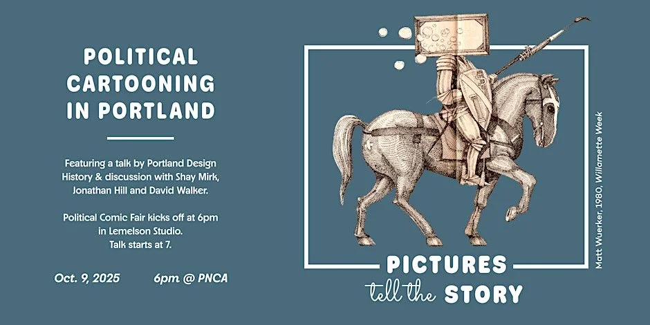 For over a century, cartoonists in Portland have illustrated characters that drove the mythology of the Pacific Northwest, offered biting commentary to the powers that be and gave a framework for regional and national issues. This event will feature a talk by Portland Design History founder, Melissa Delzio who will cover work from the mainstream Oregonian cartoonists to the rise of the “alties” of independent media. A discussion to follow with prominent local comic artists and writers: Shay Mirk, Jonathan Hill and David Walker who carry the torch of this work. Brought to you by Portland Design History, PNCA Design and AIGA Portland.
